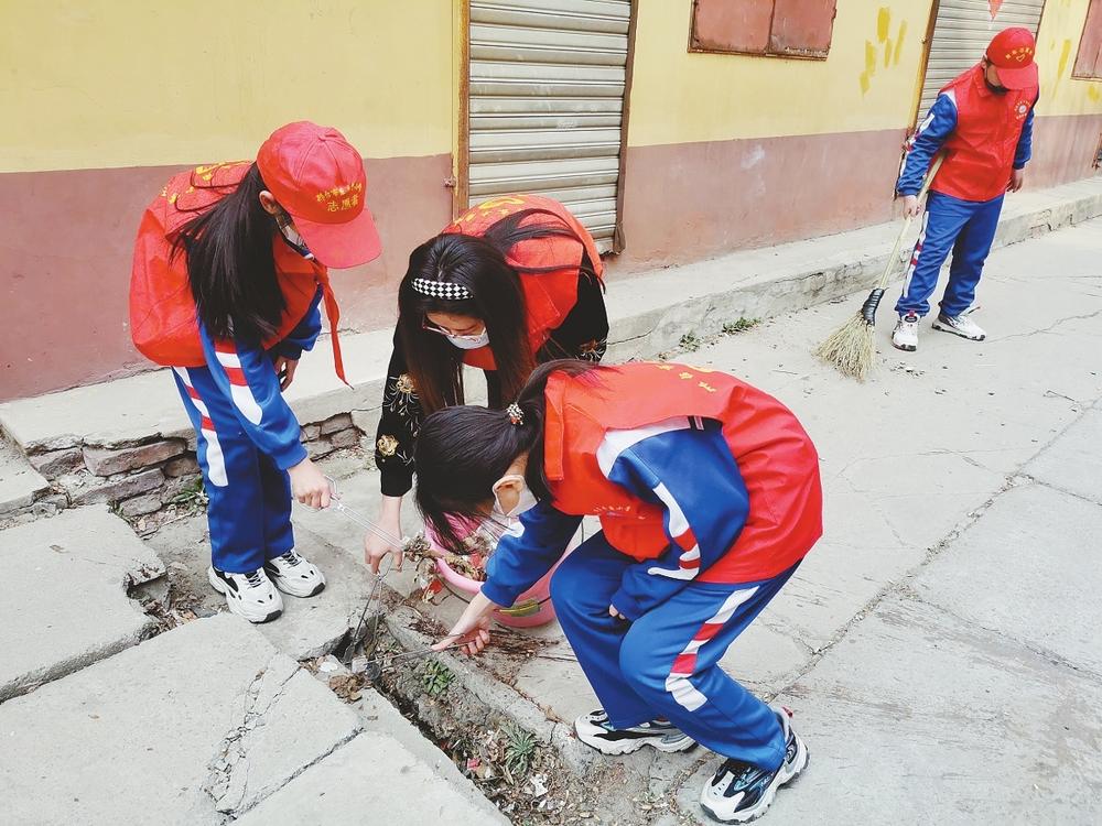 當天,學生們在老師的帶領(lǐng)下來到德馨苑小區(qū)開展志愿服務。學生們分頭行動,撿拾垃圾、清掃地面、擦公共設(shè)施等,并將煙頭、紙屑、果皮等撿拾到提前準備的垃圾袋里,忙得不亦樂乎。