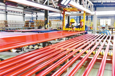 3月3日,在位于威縣高新區的一家公司,工人在生產車間加工管道。