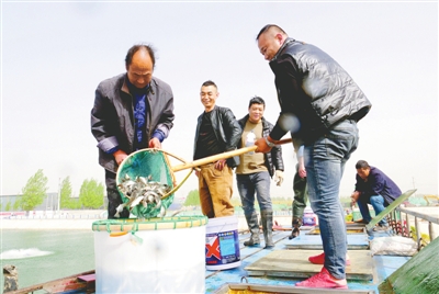 4月16日,南和區三思鎮后郭平村鱸魚養殖基地,農民在放養30萬尾鱸魚苗。