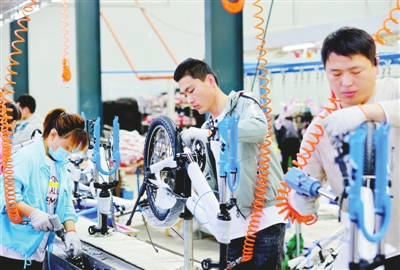 日前,在廣宗縣天王自行車科技有限公司車間生產線上,員工在組裝童車。