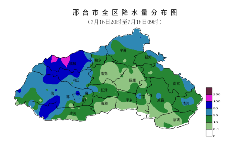 16日20時~18日09時,全市平均降雨量30毫米,50毫米以上48站出現在信都區、臨城、內丘、沙河、寧晉,100毫米以上出現在臨城閆家莊112.2毫米、屯院112.1毫米、官都村111毫米、石家欄100.8毫米、石城100.7毫米,市氣象局50.8毫米,最大小時雨量臨城官都村45毫米(18日02:00~03:00)。