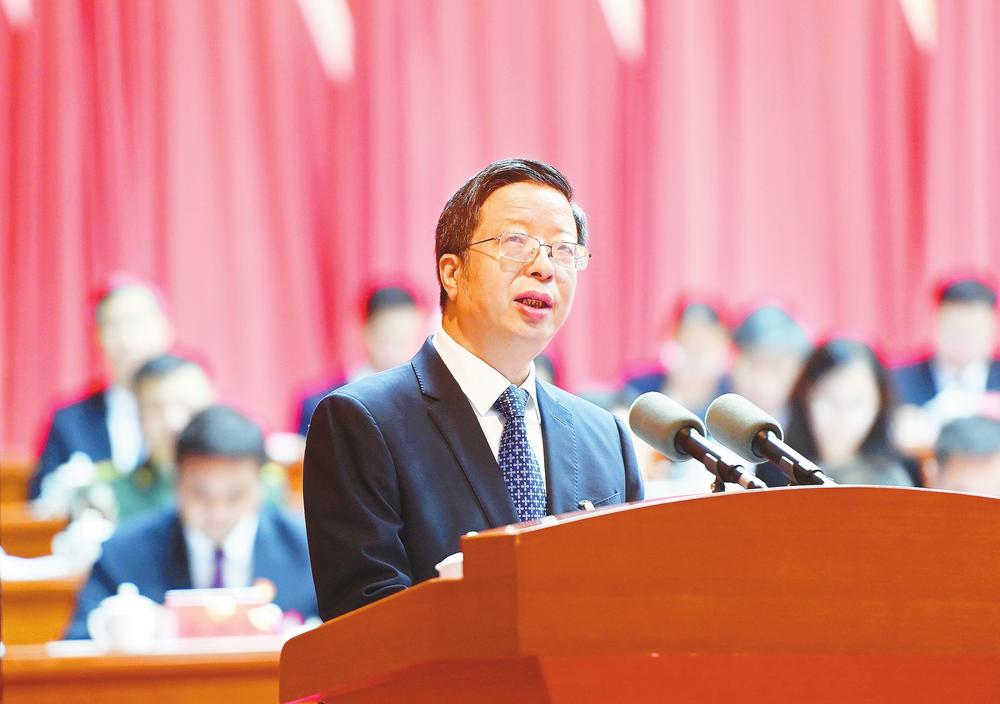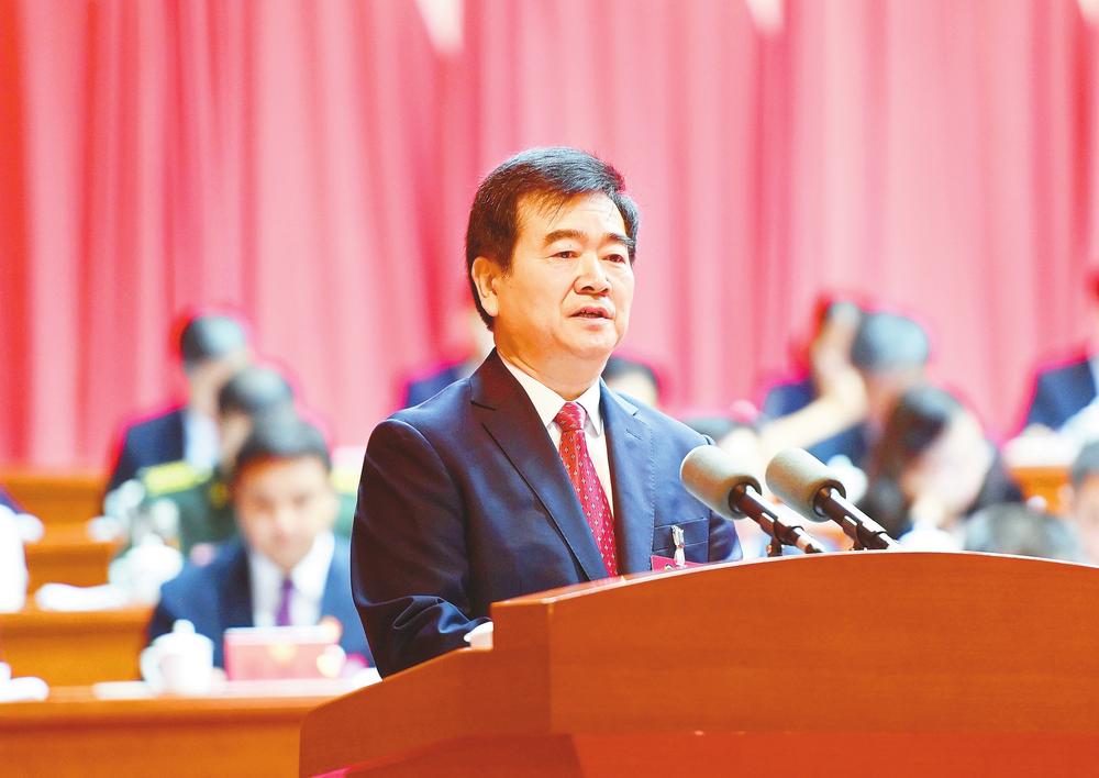 市政協主席邱文雙作政協邢臺市第十三屆委員會常務委員會工作報告。 (本報記者 李義厚攝)