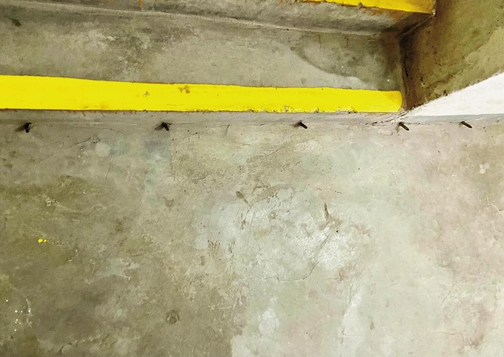 記者現場走訪:在王女士的帶領下,記者來到了通往該小區地下車庫的通道,順著臺階往下走,在臺階兩側緊鄰墻體處,一顆顆向樓梯內側傾斜的釘子沿臺階走勢一字排開,其平均長度約有3厘米,如靠墻一邊行走,稍不注意便會剮蹭到鞋子。