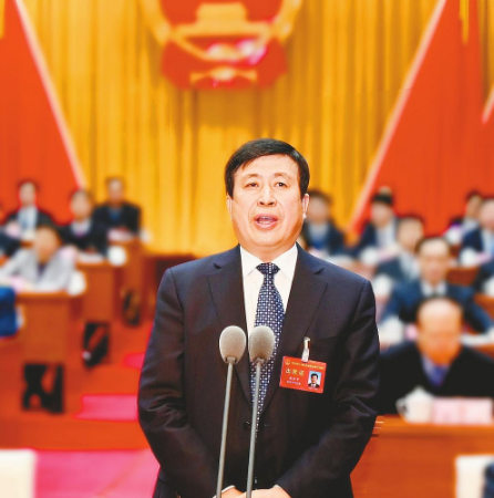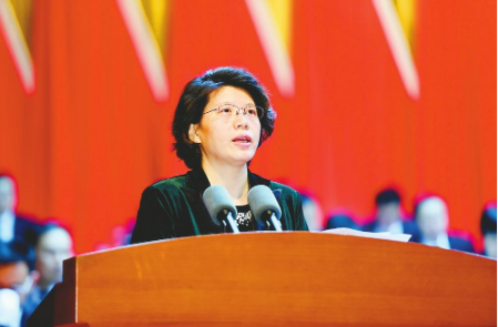 宋華英作政府工作報告。 (本報記者 黃濤攝)