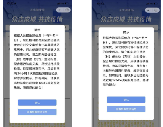 彈窗提示的內(nèi)容為:根據(jù)大數(shù)據(jù)推送信息(*年*月*日),您近期可能與新冠肺炎感染者存在時空交集或有中高風(fēng)險地區(qū)旅居史,河北健康碼暫不能確認(rèn)您的健康狀況。請立即向居住社區(qū)(村)或單位(賓館)主動報告,配合履行防疫義務(wù),盡快進(jìn)行核酸檢測。待基層排查完畢,且您有規(guī)定的檢測陰性記錄,解除彈窗提示。如有疑問,請聯(lián)系當(dāng)?shù)胤酪咿k或致電12345政務(wù)服務(wù)熱線,感謝您的配合!