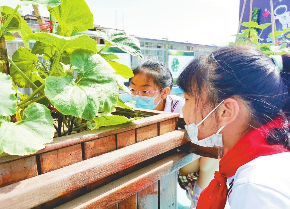 “哇,‘太空小黃瓜’又長(zhǎng)高了兩厘米!”5月31日,市新華南路小學(xué)一年級(jí)(4)班的韓湙銥正拿著尺子仔細(xì)測(cè)量著黃瓜的莖高,并認(rèn)真地記錄下來(lái)。這是該校天臺(tái)上的種植園,它的面積不算大,但承載著學(xué)生們的“宇宙級(jí)心愿”。