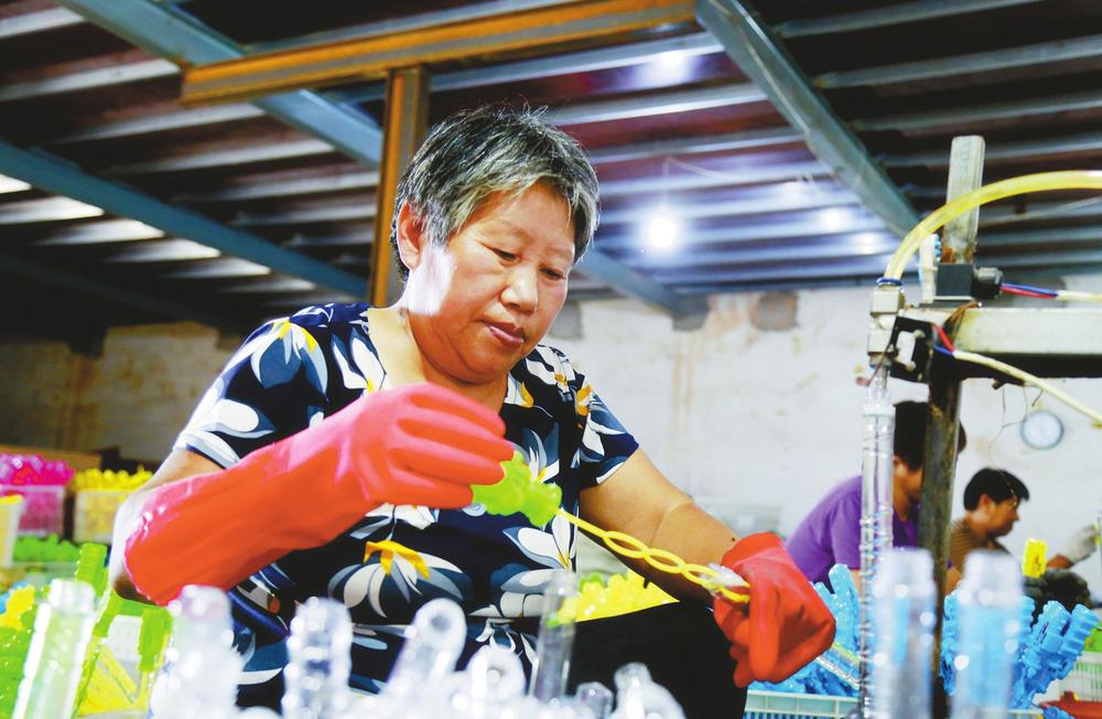 近日,新河縣尋寨鎮東小漳三村農民在一家微工廠加工泡泡水小玩具。