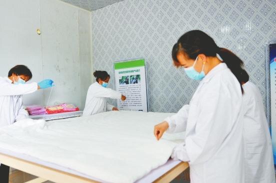 沁臨公司冷庫里,堆放著各種桑蠶產(chǎn)品。北邊一張木頭床上,劉東芳等5個(gè)姐妹們一邊做蠶絲被,一邊快樂地聊著天。