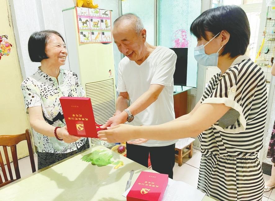 在中國共產黨成立101周年到來之際,6月29日,邢臺日報社開展“光榮在黨50年”紀念章頒發活動。離退休工作部、黨群工作部工作人員來到擁有50年黨齡的老黨員家中,一一頒發紀念章并進行慰問,讓老黨員切身感受到黨的溫暖。(籍明泉攝)