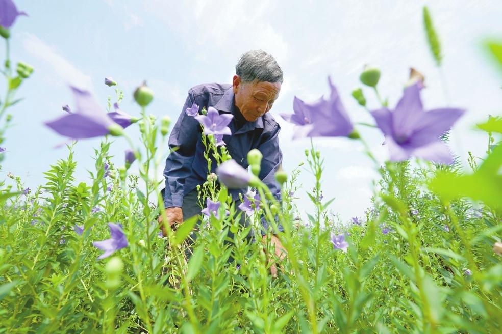▲近日,臨城縣黑城鎮豐盈村農民在桔梗田間除草。
