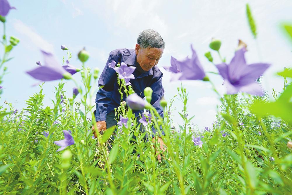 7月6日,臨城縣黑城鎮豐盈村農民在桔梗田間除草。近年來,位于太行山東麓的臨城縣因地制宜,在太行山丘陵地帶發展中藥材種植,通過政策支持、龍頭帶動、產業推動等措施,在全縣推廣種植柴胡、桔梗、黃芩、草紅花等中藥材,種植面積約3萬畝,促進農民增收和農業增效,助力鄉村振興。新華社發(田曉麗 攝)