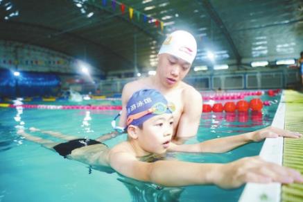 7月31日,在我市一家游泳館內,專業教練將游泳和防溺水有機結合,培養孩子們的游泳技能和自救能力。