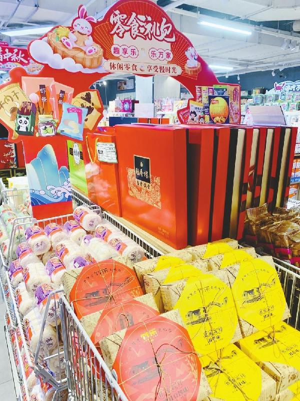 8月17日,在開元路一家大型超市內,月餅專售貨架被裝扮一新,一輪“圓月”下,“月滿中秋”4個字很是顯眼。這個貨架上,大都是超市自己烤制的手工月餅。酥皮月餅、多種口味的水果月餅被整齊碼放在貨架上,一旁還備有禮盒,不時有顧客駐足選購。整個超市里,多個位置都設有這樣的貨架,使得節日的氛圍感濃了起來。