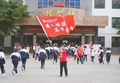6月7日,隆堯縣第一中學(xué)高考考點(diǎn),值班老師舉著寫(xiě)有“旗開(kāi)得勝高考圓夢(mèng)”的旗子給學(xué)生助威加油。 潘志方、梁亞飛攝