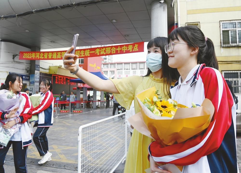 6月9日,在市第十中學(xué)考點(diǎn),家人們用鮮花和擁抱迎接考生。當(dāng)日,全市高考落下帷幕。本報(bào)記者 黃濤