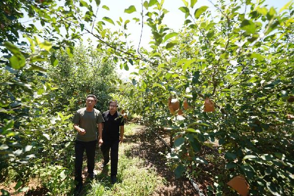 ↑6月30日,賈志華(右)與隊(duì)員梁國(guó)軍查看蘋果長(zhǎng)勢(shì)。