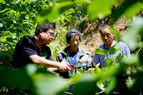 ↑6月30日,賈志華(前右二)在河北省臨城縣賈莊村為農(nóng)民講解核桃樹(shù)夏季管理知識(shí)。