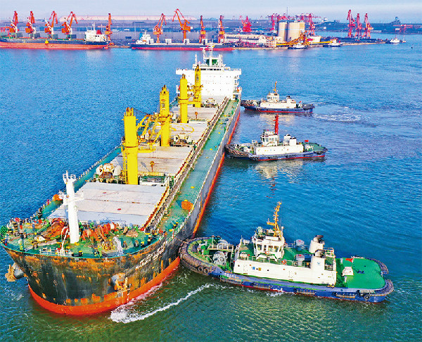 河北省交通優(yōu)勢便利,已經(jīng)形成陸海空綜合交通運輸網(wǎng)絡(luò),2022年唐山港貨物吞吐量達到7.69億噸,躍居世界第二位。圖為一艘輪船在拖輪協(xié)助下向河北港口集團唐山港曹妃甸港區(qū)礦石碼頭靠泊。 河北省委宣傳部供圖 史晟全/攝