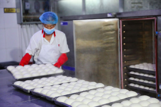 河北省寧晉縣一安置點的食堂工作人員在為轉移群眾準備主食。(新華社記者趙鴻宇攝)
