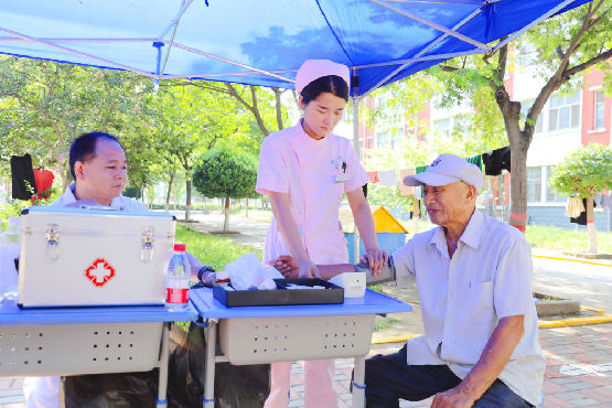河北省寧晉縣一安置點的醫護人員在為轉移群眾量血壓。(新華社記者岳文婷攝)