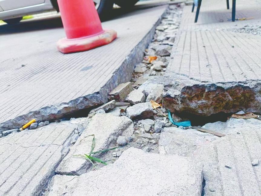 8月9日上午,記者前往該小區了解情況。現場,一條長約5米、寬約15厘米的裂縫橫穿路面。路面起鼓處,有長約1.5米、高約8厘米的不規則縱向裂縫。西側地面有長約4米、寬約80厘米、高約6厘米的下陷區域。