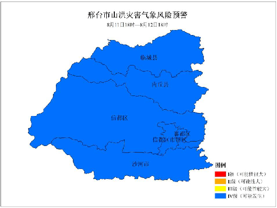 2023年8月11日18時邢臺市水務局和邢臺市氣象局聯合發布邢臺市山洪災害氣象風險預警:11日18時至12日18時,邢臺市臨城縣、內丘縣、信都區、沙河市山洪災害氣象風險等級為Ⅳ級,可能發生山洪災害。