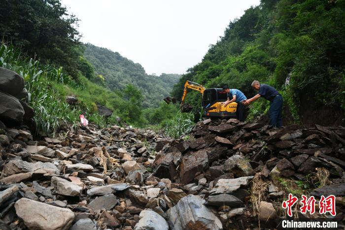 8月9日,河北省邢臺市臨城縣趙莊鄉梁家莊村一條正在修復的田間道路,村民自發在該路段清理碎石。 中新社記者 翟羽佳 攝