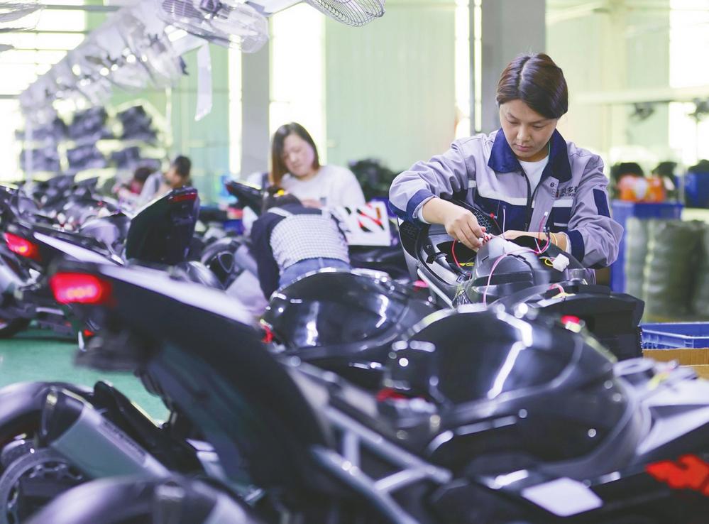 圖為河北貝多奇兒童玩具有限公司生產(chǎn)車間,工人在組裝電動摩托車。