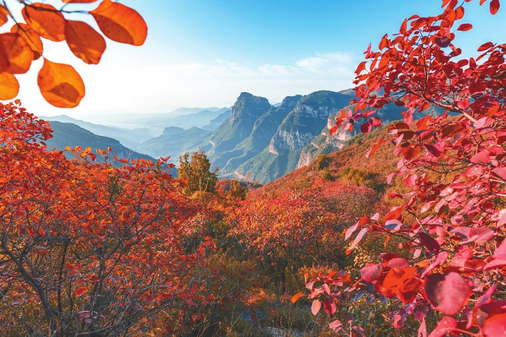 停車坐愛楓林晚,霜葉紅于二月花。金秋十月,位于邢臺市西部的云夢山、九龍峽景區迎來了一年中最美的季節。登高遠眺漫山遍野的紅葉,色彩斑斕的山林與藍天流云相映成趣,構成一幅多姿多彩的秋日畫卷。 (邢臺新聞傳媒中心記者 霍紅軍 攝)