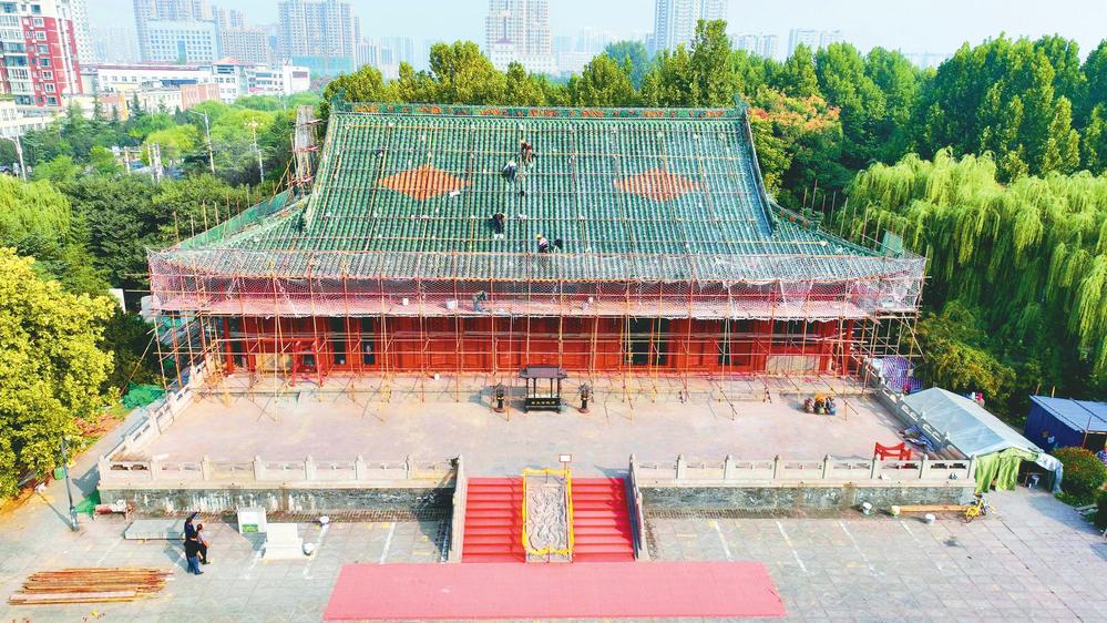 10月14日,工人在順德府文廟大成殿進行施工作業(無人機照片)。
