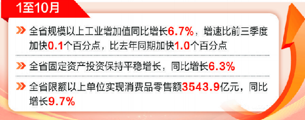 數據顯示,1至10月,全省規模以上工業增加值同比增長6.7%,增速比前三季度加快0.1個百分點,比去年同期加快1.0個百分點。其中,10月份規模以上工業增加值同比增長6.8%。