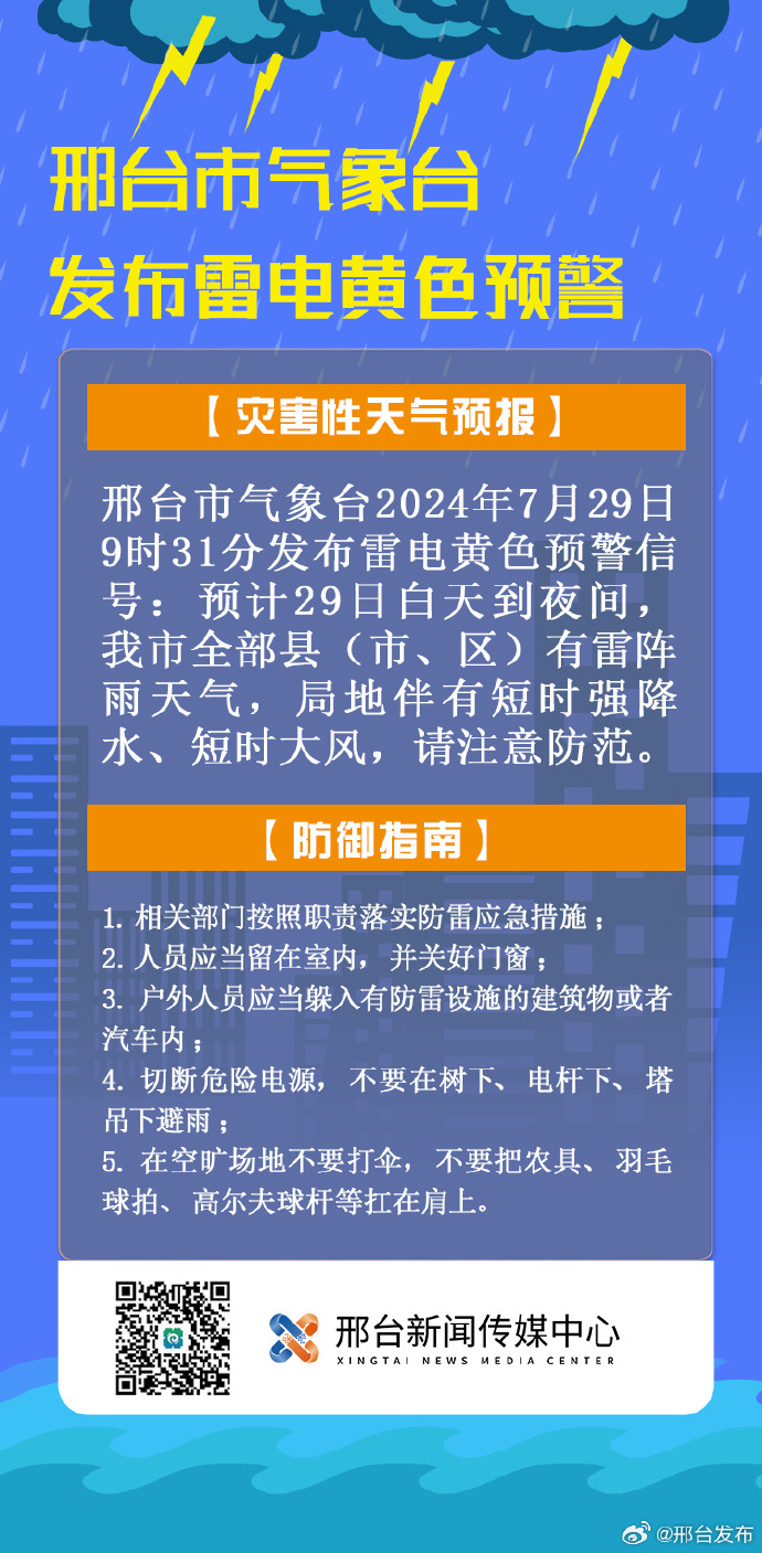 邢臺市氣象臺2024年7月29日9時31分發布雷電黃色預警信號