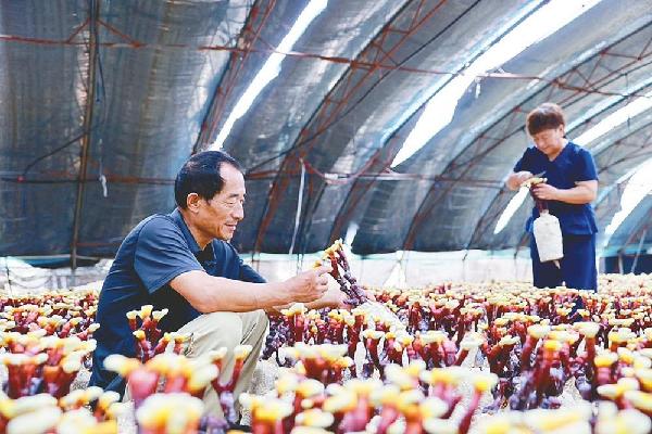 近日,農民在廣宗縣大柏社靈芝種植基地管護靈芝。