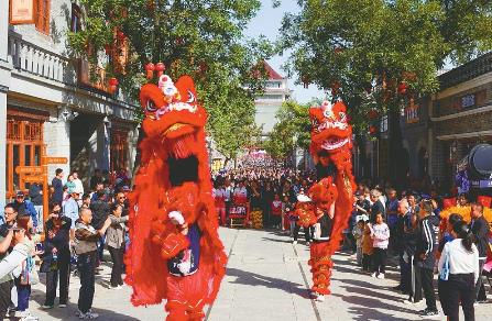國慶假期以來,邢州古城好南關的舞獅表演吸引大量游客前來拍照游玩。 本報記者 韓文洲攝