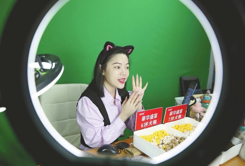 位于南和區河郭鎮的一家寵物食品企業,主播在通過網絡直播銷售產品。武國棟攝