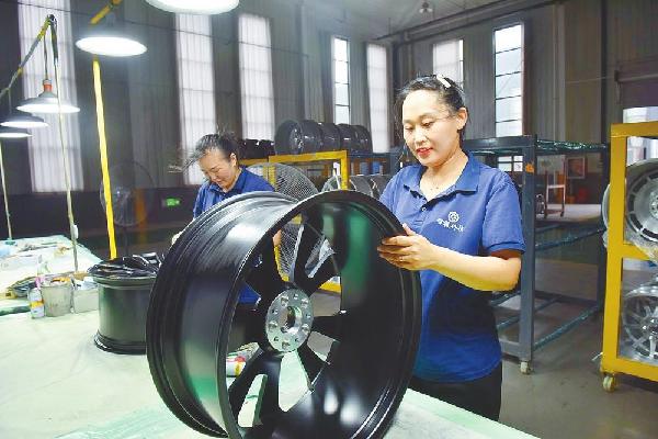 日前,威縣一家汽車輪轂生產企業工人在對輪轂進行質檢。