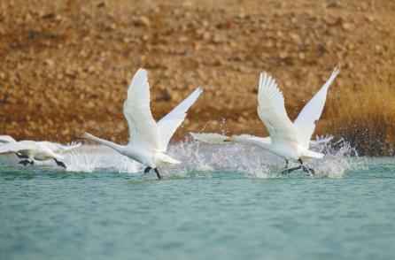 2月18日,在信都區白馬河上游,成群結隊的天鵝沐浴著朝陽翩翩飛舞或悠閑嬉戲,繪就了一幅蓬勃秀美的初春生態畫卷。
