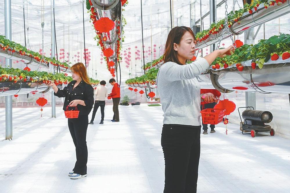 日前,游客正在位于市經開區北俎村的一家智慧農業園采摘草莓。近年來,市經開區積極加快農業科技創新和數字化轉型,建成投產一批生產效率高、產品價值高的智慧農業產業園,促進農業增產增效。