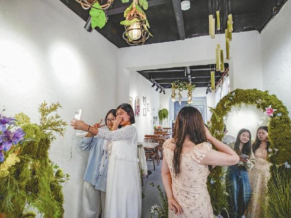 日前,游客在好南關花市街一家店鋪打卡拍照。本報記者 韓文洲攝