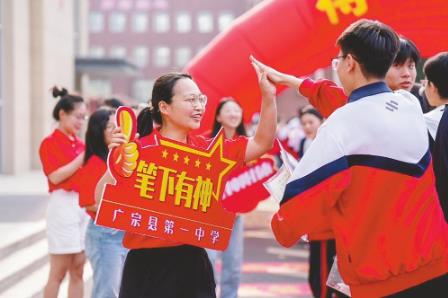 6月7日,廣宗縣第一中學考點,送考老師與考生互動加油。張馳、侯志營攝