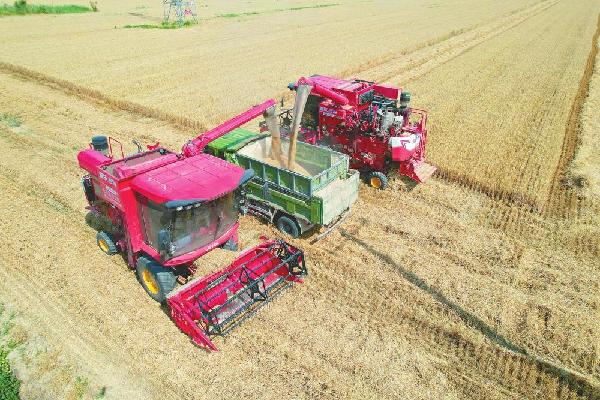 近日,在巨鹿縣堤村鄉賈莊村,當地村民正搶抓晴好天氣,有序開展小麥收割工作,確保夏糧顆粒歸倉。 韓文洲、張博攝