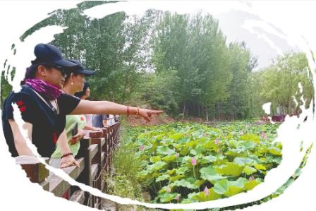6月14日7時,北唐村語荷田園綜合體東區荷塘邊已有游客架起相機,精心尋找角度與初荷合影,寬闊的水面被碩大的荷葉層層覆蓋,遠遠望去,宛如鋪開了一張碧綠絨毯。在這片醉人的綠意之上,粉色、白色的荷花星星點點、漸次綻放,亭亭玉立的身影點綴其間。雖然尚未達到“接天蓮葉無窮碧”的盛況,但這份清麗可人的初綻景象,已吸引了不少游客前來感受夏日荷韻。來自石家莊的游客李立君一邊用手機記錄一邊笑著說:“去年夏天這里的荷花開得特別壯觀,給我們留下了深刻印象。今年聽說荷花開了不少,就趕緊過來先睹為快。這里的荷葉大如圓盤,荷花帶著股自然生長的靈動感。”游客們的歡聲笑語,為靜謐的荷塘增添了勃勃生機。