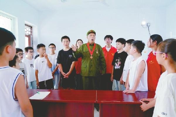 7月30日,在臨城縣東鎮鎮南孟村的暑期公益課堂,老兵劉愛國為孩子們講述當年在戰爭中沖鋒陷陣的故事。韓文洲、徐少立攝