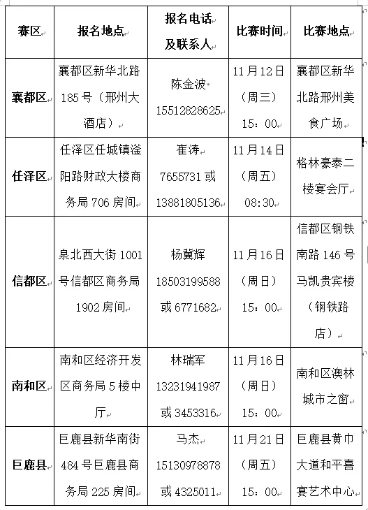 目前,五大賽區(qū)報名通道已同步開啟,有意向的烹飪愛好者可前往就近賽區(qū)指定地點報名,報名詳情可咨詢各賽區(qū)商務局。各賽區(qū)具體報名及比賽信息如下: