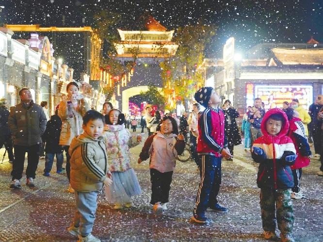 11月21日,好南關街區新上線的人工造雪景觀區吸引了眾多游客前來賞“雪”打卡。