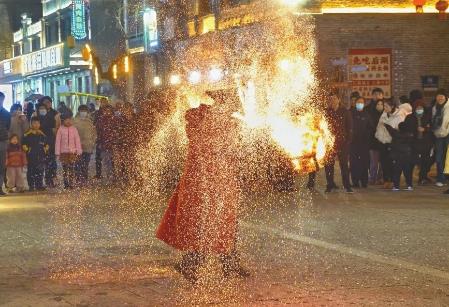 12月21日晚,民間藝人在好南關街區進行火壺表演。